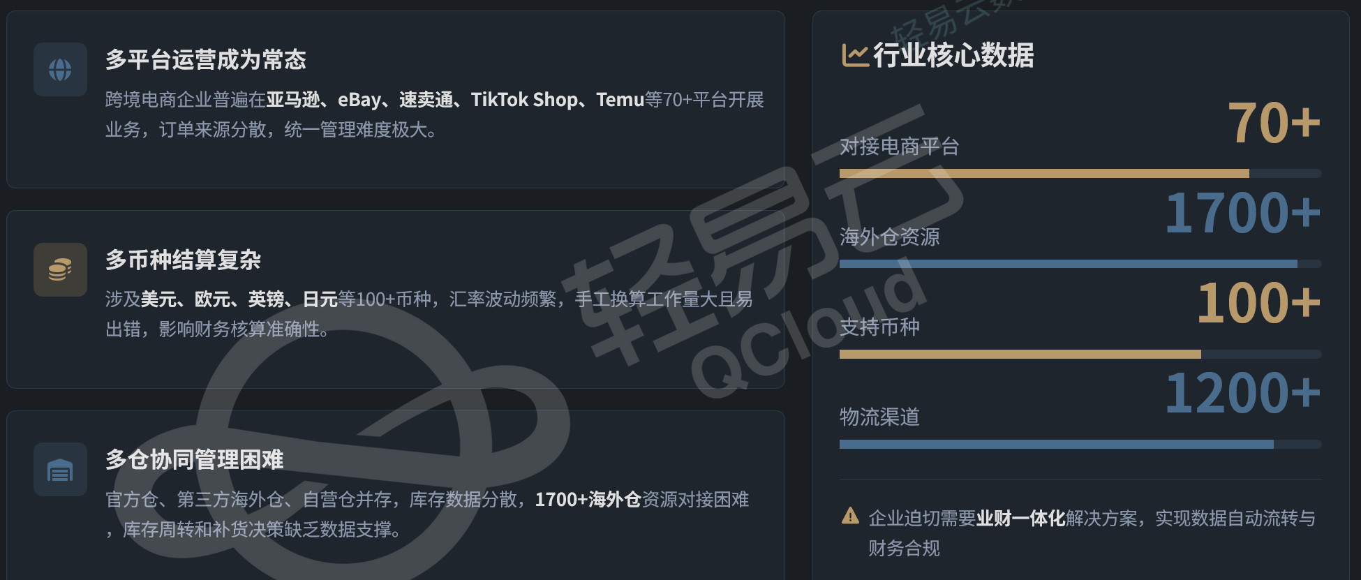 据行业调研,60%的跨境电商企业因业财分离导致利润核算偏差超15%,税务合规问题发生率上升40%,严重制约企业规模化发展。