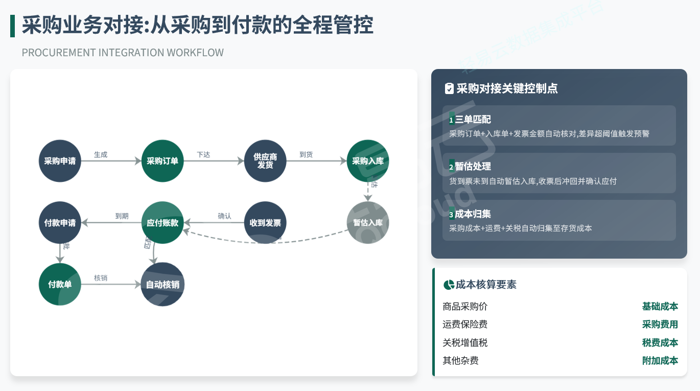 从采购申请到付款核销,业务流与财务流需保持严格一致: