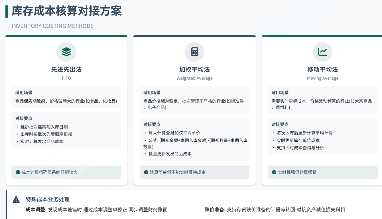 不同行业对成本核算有不同要求,数据集成需支持多种计价方式: