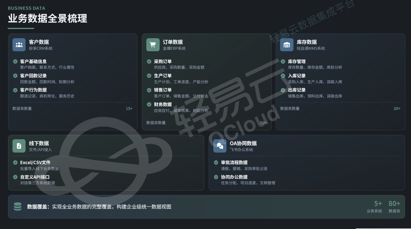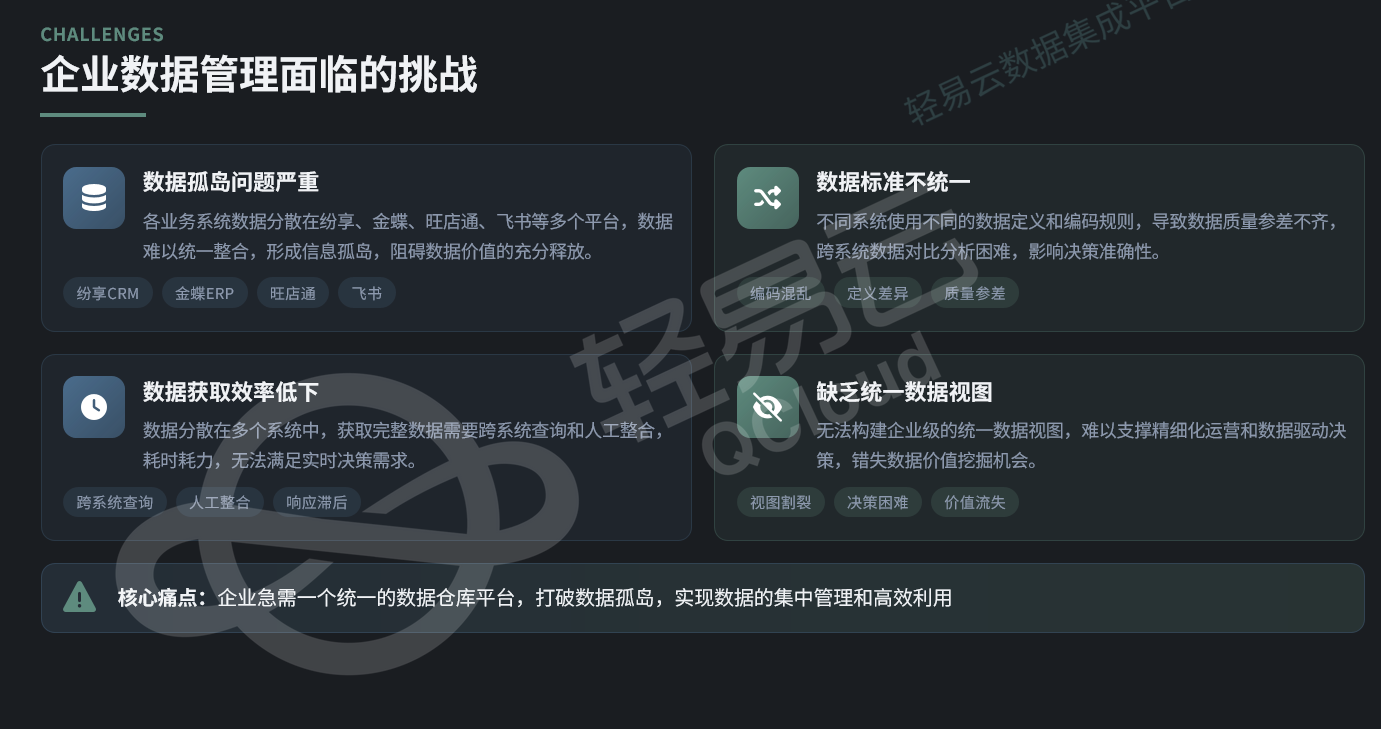 随着企业信息化程度的提升,业务系统数量不断增加。纷享CRM、金蝶ERP、旺店通WMS、飞书OA等系统在企业内部并行运行,形成了典型的多源异构数据环境。这种环境带来以下结构性问题: