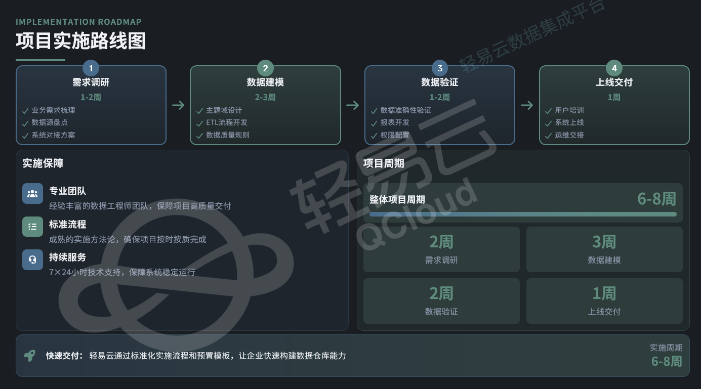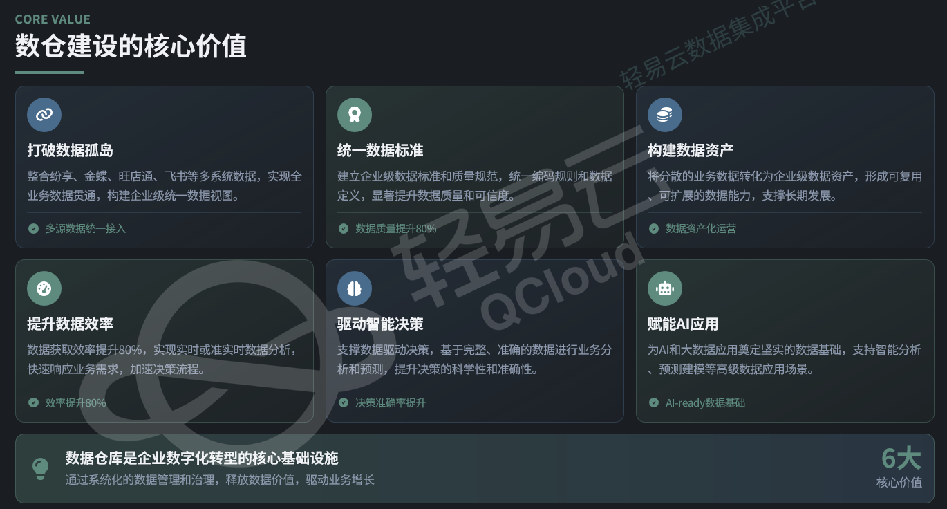 在实施过程中,采用配置化、低代码的数据平台可以显著缩短实施周期(从数月缩短到数周),降低技术门槛,使企业能够更快地构建数据能力。数据仓库的价值最终体现在数据获取效率的提升、数据质量的改善,以及对业务分析需求的响应速度上。
