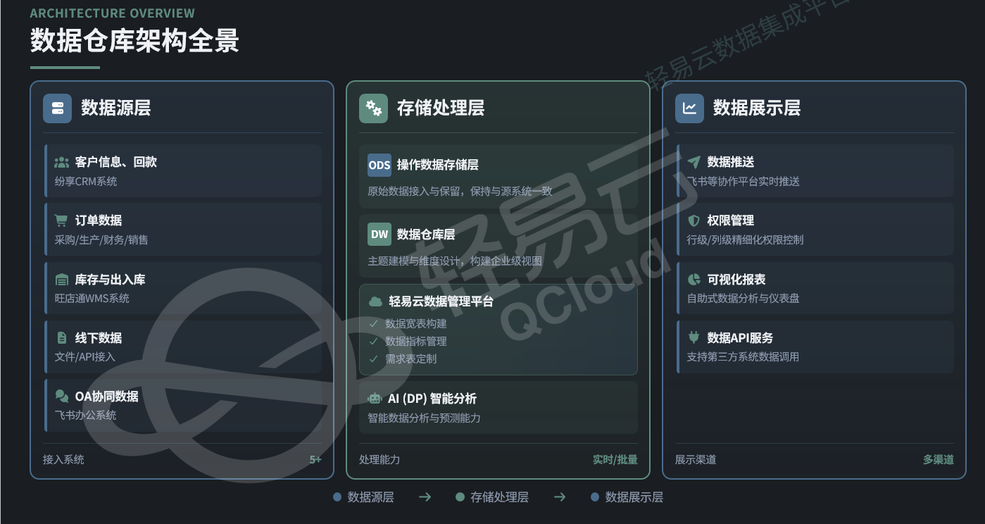 整合CRM的客户信息、ERP的交易记录、WMS的物流数据,构建完整的客户画像,支持客户价值分层和购买行为分析。