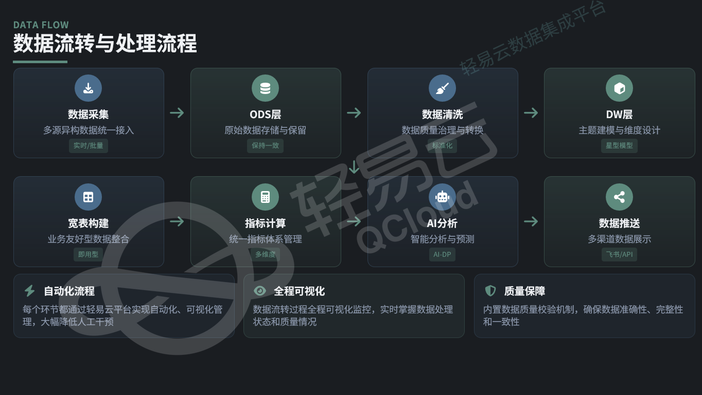 包含数据仓库的核心处理引擎,支持实时同步和批量抽取两种模式。实时同步适用于监控场景,延迟控制在秒级;批量抽取适用于报表分析,通过定时调度执行。