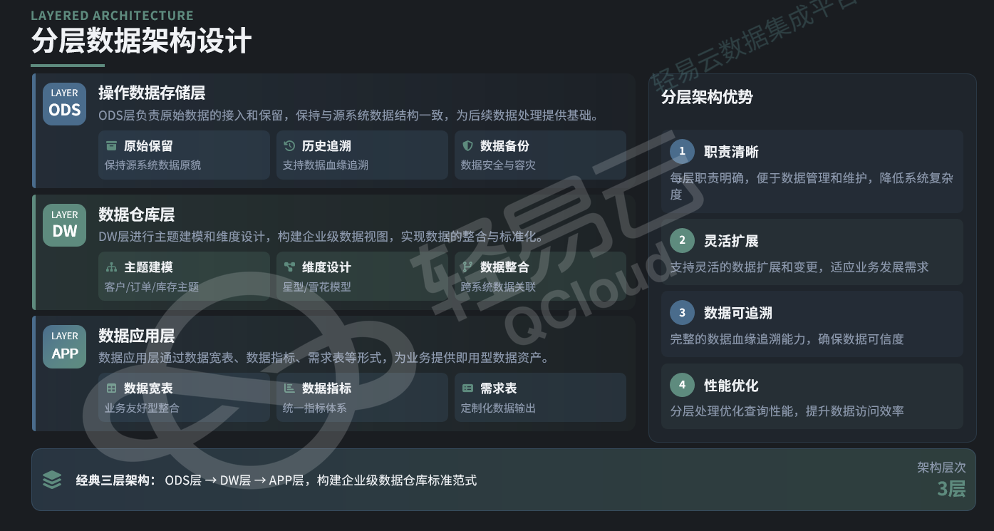 企业数据仓库建设是数据管理的基础设施工程,其核心目标是解决数据分散、标准不一、获取困难等问题。通过采用分层架构设计(ODS-DW-APP),企业可以实现:
