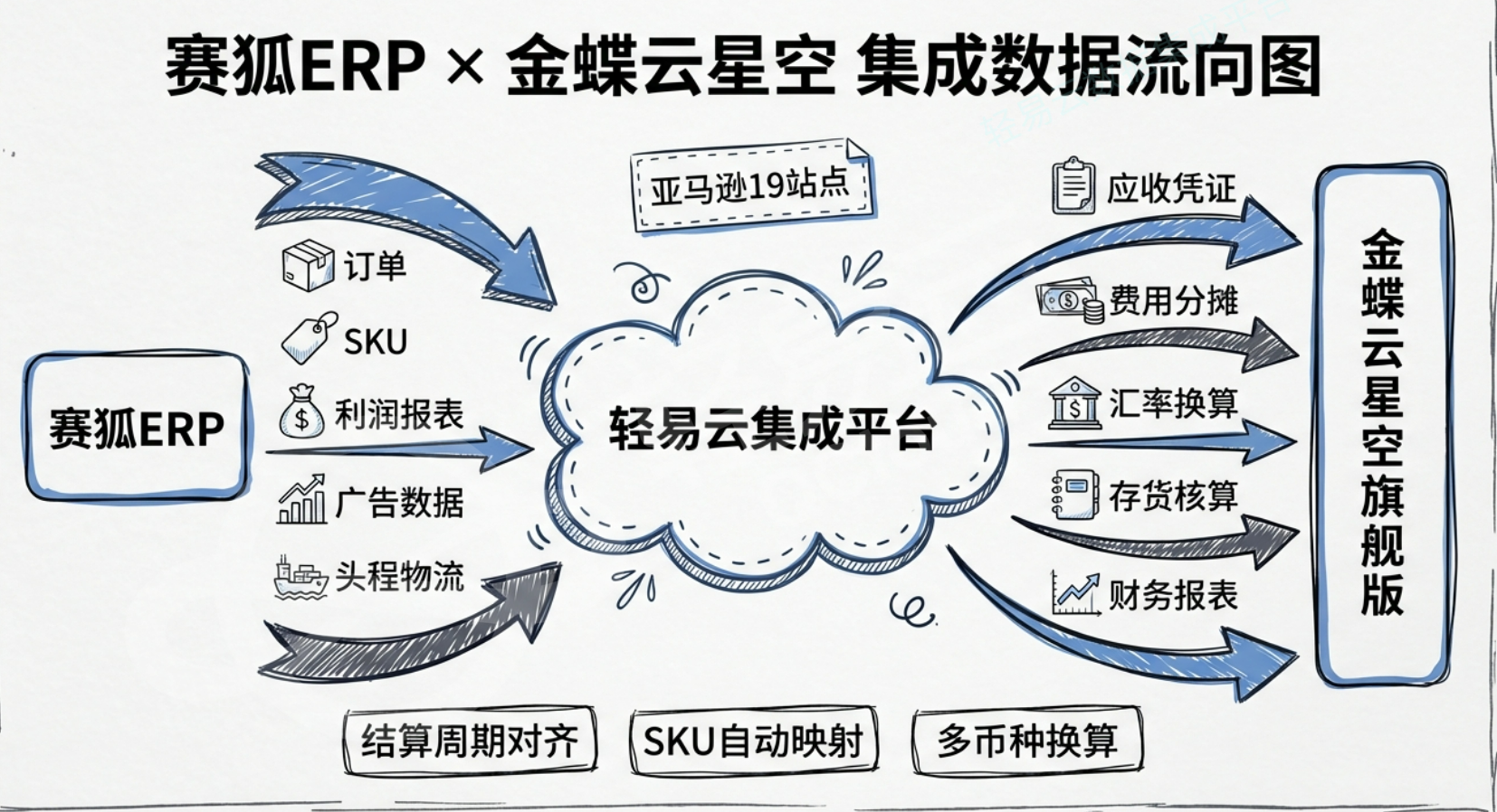 赛狐自动同步亚马逊结算报告,集成平台按金蝶自然月重新组织数据(亚马逊14天结算 vs 金蝶自然月需做周期切割),自动生成"销售应收单",包含:订单号、站点、币种、汇率、人民币收入。